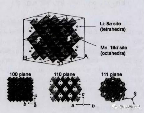 早在1983年M.Thackeray和 J.Goodenough等人發現了錳尖晶石可作為鋰離子電池正極材料,理論容量為148mAh/g。尖晶石LiMn2O4結構中氧以立方密堆方式排列組成其晶胞骨架,其中Li+占據1/8的氧四面體8a位置,Mn原子占據1/2氧八面體16d位置。結構中錳有兩種價態,分別為Mn3+和Mn4+,各占50%,材料結構如圖4所示。