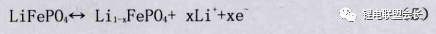 氧原子以輕微扭曲的六方密堆方式構成晶胞的基本骨架,FeO6八面體靠頂點共用氧原子相連。LiO6八面體則靠共邊相連形成鏈狀,每個PO4四面體分別與一個FeO6八面體 和兩個LiO6八面體共邊。所有的氧離子都與五價的磷原子通過共價鍵結合,由于P-O鍵作用力強,P起到了穩定整個骨架的作用,材料的熱穩定性非常好,耐過充能力強。其電極反應如式5所示。