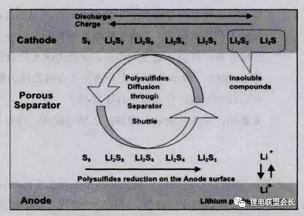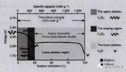 接著隨著進一步的放電,在2.1V電壓平臺處,可溶性Li2S4轉化成不溶性的固相Li2S2,最后再進一步生成終產物固相的Li2S,由于這一階段中固體開始生成,使得離子擴散變慢,所以反應速度較緩。不同于傳統的鋰離子電池材料,鋰硫電池充放電時單質硫和硫化鋰中間經過多硫化鋰Li2Sx(x=2-8)而并不是通過鋰離子在正極材料和負極材料之間的往返嵌入和脫嵌來實現充放電的,因此鋰硫電池性能受正極材料的鋰離子脫嵌能力影響小。