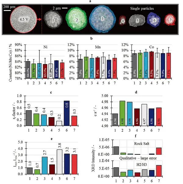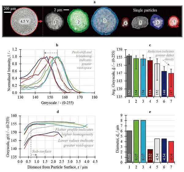 為了進一步表征次級顆粒在高電壓下的形貌及結構,作者對在4.5 V下循環充放電后極片上的顆粒進行了深入分析。這些顆粒的信息源自X射線衍射及熒光檢測,并通過X射線納米斷層掃面技術進行成像。通過該方法繪制了不同顆粒的灰度直方圖(圖3b,c)及顆粒徑向的灰度信息。發現顆粒1灰度值最高,表明該顆粒包含的缺陷數量最少,顆粒7灰度值最低,意味著該顆粒可能存在大量缺陷。由圖3d可看出,顆粒灰度值(缺陷數量)與顆粒尺寸間沒有明顯的關聯,因此在低倍率(0.5 C)下,顆粒的尺寸大小并不是造成次級顆粒裂痕的主要因素。