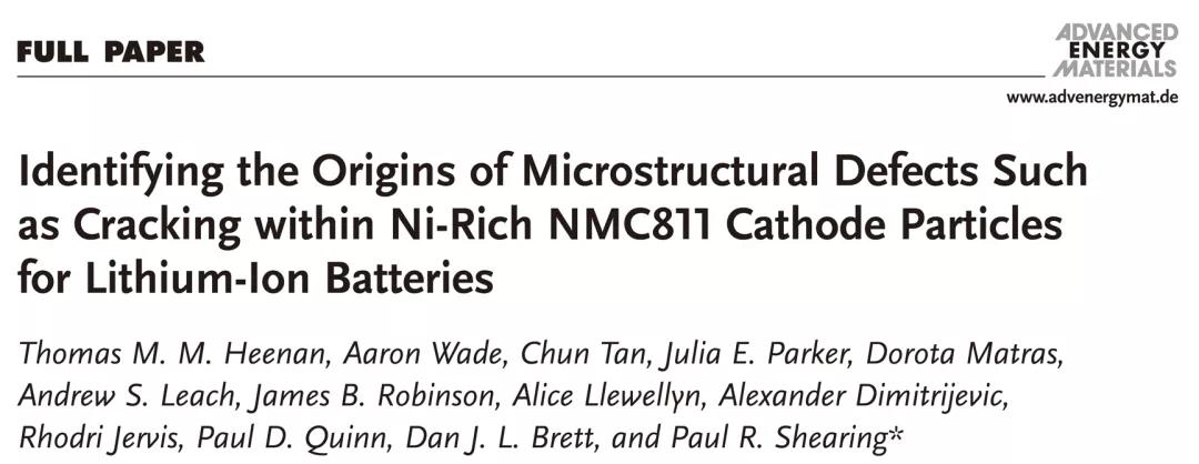 電極材料晶體學、材料宏觀結構及材料電化學性能三者間的關系錯綜復雜,跨越由微觀到宏觀多個尺度。從原子尺度出發,材料循環過程中引發的Ni-Li反位點缺陷被認為是NMC811顆粒間碎裂的主要原因,這種由晶體結構變化引起的初級顆粒位錯會進而導致次級顆粒間出現裂痕,最終使得材料在充放電過程中層間距增大,塊體碎裂,失去電接觸。而Mn元素的引入可以大大提高Ni在晶格中的穩定性,但Mn在循環中的溶解現象是否會對NMC811電池產生影響,又是否是材料出現裂痕的根源呢?近日,倫敦大學學院的Paul R. Shearing教授在Advanced Energy Materials期刊上發表了題為“Identifying the Origins of Microstructural Defects Such as Cracking within Ni-Rich NMC811 Cathode Particles for Lithium-Ion Batteries”的文章。該工作深入研究了不同尺度下高鎳三元正極材料(NMC811)在組裝、充放電等各過程的碎裂機理,從極片水平出發,進而深入至顆粒水平,分析初級/次級顆粒及電極材料界面的接觸性和循環過程中顆粒內部和顆粒間Ni,Co,Mn含量變化等角度出發,探尋材料缺陷及顆粒裂痕出現的根源。