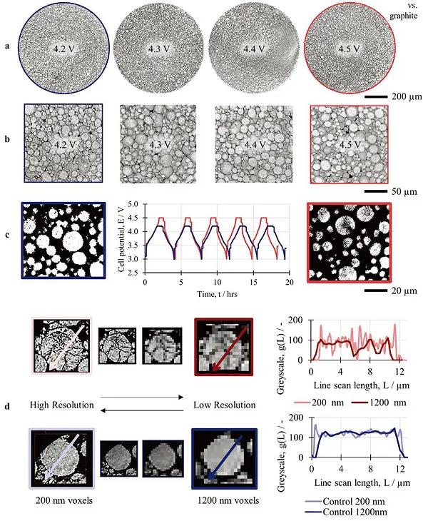 工作電壓的提高可以獲得更高的比容量,但往往會引起材料不可逆的衰降。為了研究高電壓下NMC811正極材料的衰降情況,作者將同一批電池(負極為石墨)在4.2-4.5 V的截止電壓下進行充放電循環。從極片水平出發,由圖2a可看出,在較高的截斷電壓下(4.4和4.5 V),材料與集流體發生脫離,且極片表面出現較大裂痕。裂痕的出現有可能與CT樣品的制備過程有關,但即便如此,高電壓下的樣品在裁片過程中發生了區別于低電壓樣品的大規模剝離現象,因此高彈性粘結劑的研發同樣不可或缺。從顆粒水平的灰度體渲染(圖2b)可觀察到不同截止電壓下,顆粒表面粗糙度沒有明顯區別,但高電壓下中心區域存在較多孔洞。圖2d為不同分辨率下顆粒的灰度成像圖,對比缺陷顆粒(紅色框)及原始顆粒(藍色框)圖像可看出,即使在低分辨率下,灰度體渲染成像圖仍然能看出明顯的缺陷結構。由于分辨率的降低可以擴大觀察視野,一次性獲取更多顆粒的結構信息,因此利用灰度圖進行低分辨率成像是一種快捷分析大量顆粒缺陷情況的有效途徑。