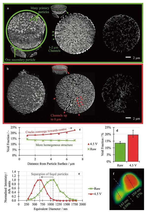 圖7a為未循環的原始次級顆粒,圖7b為充電至4.5 V后放電至3.0 V,經歷5圈循環后的次級顆粒。二者的3D表面成像并無較大差異,但亞表面成分分析結果則大相徑庭。經過5次循環后,次級顆粒由外向里孔隙率不斷提高(圖7c),這表明顆粒裂痕在中心區域匯集。由于顆粒間的界線在該分辨率下難以區分,緊挨的顆粒對在計算粒徑分布時認定為一個顆粒(圖7f)。由圖7e可看出,初期循環后初級顆粒的粒徑由1微米減小至600納米,表明大部分初級顆粒在循環過程中出現分裂,“融合”的顆粒對也大大減少,顆粒間的接觸也有所降低。