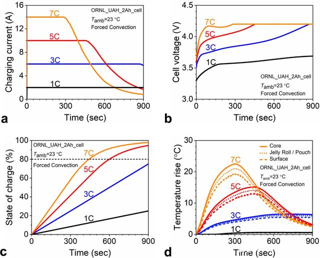 下圖為采用強(qiáng)制對(duì)流冷卻時(shí),鋰離子電池在不同倍率充電時(shí)的電流、電壓、SOC和溫度變化。圖a顯示當(dāng)電池電壓開始穩(wěn)定在4.2V時(shí),電流快速降低。7C充電時(shí)僅需280s便達(dá)到4.2V的截止電壓,而5C、3C、1C所需的時(shí)間分別為450s、860s和大于3000s。圖b顯示以7C倍率充電,僅需7.5min便能充電至80%SOC,5C倍率充電至80%SOC所用的時(shí)間為10min。然而,3C和1C倍率充電分別需要經(jīng)過16min和50min以上才能達(dá)到80%SOC。盡管5C或7C倍率充電能大大縮短充電時(shí)間,但是電池的溫度增加程度和速度均大大超過1C倍率充電。7C充電300s,電池中心的溫度增加了22.5℃,而1C充電300s,電池中心溫度增加不足0.5℃,在整個(gè)充電過程中的中心溫度增加也不足1.5℃。以更快的倍率充電,從電芯中心到表面和環(huán)境的厚度方向的溫度梯度也更大。1C倍率充電時(shí)的溫度梯度小于0.2℃,而7C倍率充電時(shí)達(dá)到了3.4℃。嵌入的微型熱電偶會(huì)導(dǎo)致額外熱阻增加,人為造成更大的溫度梯度。因此,需要采用更薄的溫度傳感器或者非侵入式的內(nèi)部溫度測量技術(shù)來消除這種影響。