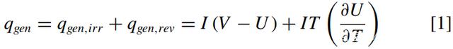 以上討論發(fā)現(xiàn)7C和5C充電時(shí)溫升更高更快,這歸因于更高的產(chǎn)熱速率。通過忽略混合熱效應(yīng),電池的產(chǎn)熱可只表達(dá)為不可逆熱和熵變熱之和,具體見等式1: