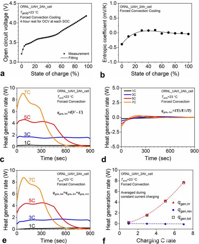 下圖為充電時(shí)產(chǎn)熱估算的結(jié)果,包括通過對(duì)照組電池測量的SOC-OCV曲線,對(duì)照組電池不同SOC下的熵變系數(shù),實(shí)驗(yàn)電池的不可逆產(chǎn)熱、可逆產(chǎn)熱、總產(chǎn)熱和平均產(chǎn)熱。同一SOC下電池開路電壓隨溫度的變化很小(熵變系數(shù)很小),在-0.39mV/K至0.09mV/K之間,因此使用室溫下的開路電壓來估算不可逆產(chǎn)熱,所帶來的的誤差可以忽略不計(jì)。1C充電時(shí),不可逆產(chǎn)熱小于0.3W,而7C和5C充電時(shí)的不可逆產(chǎn)熱卻急劇增加至9.1W和4.6W。達(dá)到最大值后,不可逆產(chǎn)熱速率開始降低,歸因于電池內(nèi)阻隨著溫度增加而降低。當(dāng)電池電壓達(dá)到上限值時(shí),電流開始快速降低,此時(shí)不可逆產(chǎn)熱速率也相應(yīng)降低。在充電開始時(shí),可逆產(chǎn)熱為負(fù)值,然后逐漸增加至正值。在5C或7C充電時(shí),可逆產(chǎn)熱速率的幅度遠(yuǎn)小于不可逆產(chǎn)熱速率,但是在充電開始時(shí),可逆產(chǎn)熱速率會(huì)對(duì)總產(chǎn)熱速率產(chǎn)生明顯影響。從平均不可逆、可逆和總產(chǎn)熱速率的曲線可知,7C充電的平均總產(chǎn)熱速率是1C充電的34倍之多。