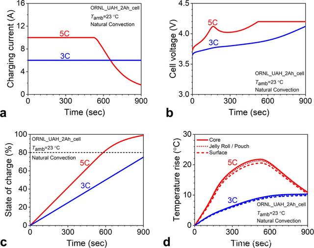 隨后作者考察了冷卻方式對(duì)電池溫升和溫度梯度的影響。下圖為在自然對(duì)流下,以3C和5C充電時(shí)電池的電化學(xué)和熱行為,包括電流、電壓、SOC和溫度曲線。在自然對(duì)流下,5C充電時(shí)的最大電池表面溫升達(dá)到20.6℃,比強(qiáng)制對(duì)流冷卻下5C充電時(shí)的最大溫升要高(僅為13℃),甚至高于強(qiáng)制對(duì)流時(shí)7C充電的最大溫升。這種對(duì)比結(jié)果表明采用類似強(qiáng)制對(duì)流的冷卻方式能控制超級(jí)快充時(shí)鋰離子電池的溫升。此外,強(qiáng)制對(duì)流冷卻的溫度梯度也大于自然對(duì)流情況,這是因?yàn)閺?qiáng)制對(duì)流會(huì)導(dǎo)致更快的熱消散。