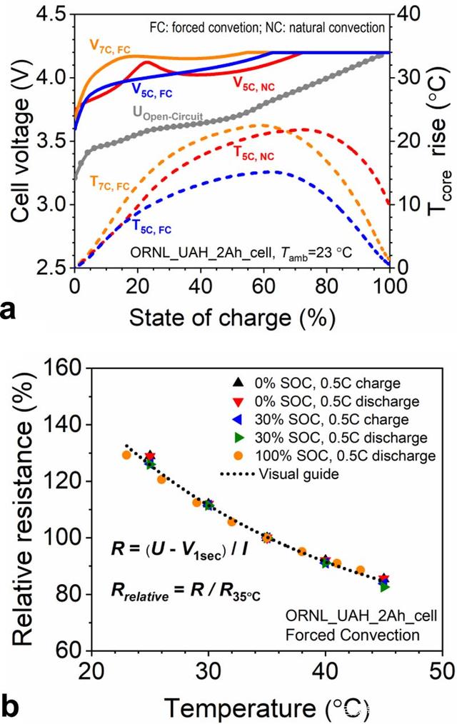 通過仔細(xì)觀察測試結(jié)果,作者發(fā)現(xiàn)強(qiáng)制對(duì)流冷卻下7C充電和自然對(duì)流冷卻下5C充電時(shí)電池電壓均會(huì)出現(xiàn)明顯的下降過程。為了更方便討論,下圖繪制了兩種情況下電池充電電壓和開路電壓隨SOC的變化關(guān)系。根據(jù)等式1可知,在恒流充電時(shí),當(dāng)電池的開路電壓U隨SOC增加而增加,而電池電壓V降低,表明產(chǎn)熱速率降低。更低的產(chǎn)熱速率導(dǎo)致更慢的溫升。快充時(shí)短暫的電壓下降現(xiàn)象歸因于開路電壓和內(nèi)阻的逆轉(zhuǎn)效應(yīng)。在充電時(shí)更高的SOC導(dǎo)致開路電壓U升高(下圖a所示),而更高的溫度導(dǎo)致電池內(nèi)阻降低(下圖b所示)。通過恒溫箱將電池進(jìn)行加熱/冷卻至特定的溫度,當(dāng)所有電池的溫度穩(wěn)定時(shí)采用0.5C(1A)進(jìn)行脈沖充電/放電。如果開路電壓的影響小于電池內(nèi)阻,那么電池電壓會(huì)降低。在兩種冷卻方式下,電池的電壓從~22%SOC至~40%SOC區(qū)間開始下降。該SOC區(qū)間的電池開路電壓隨SOC增加緩慢,如果此時(shí)電池的溫度快速增加,那么電池內(nèi)阻的影響會(huì)超過開路電壓,導(dǎo)致電池電壓降低。從22%SOC到40%SOC,在強(qiáng)制對(duì)流冷卻下,7C充電電池中心的溫度增加了6.1℃,而自然對(duì)流冷卻時(shí)5C充電電池的溫升為6.8℃。強(qiáng)制對(duì)流冷卻時(shí)5C充電電池的溫升僅為3.8℃,這也正是電池電壓出現(xiàn)短暫降低的原因。超過40%SOC后,開路電壓隨著SOC增加而快速增加,并占據(jù)主導(dǎo),造成電池的充電電壓再次增加,直至達(dá)到上限電壓。