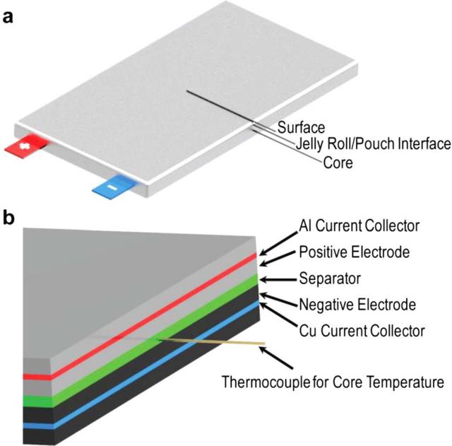 電池在超快充條件下會(huì)造成快速的產(chǎn)熱,有可能造成電池過熱,以致于縮短電池壽命以及帶來安全隱患。因此,有必要了解電池在快充條件下的熱行為。于此,阿拉巴馬大學(xué)聯(lián)合美國橡樹嶺國家實(shí)驗(yàn)室,通過在電池內(nèi)部植入微型熱電偶,原位測量了2Ah的LiNi0.6Co0.2Mn0.2O2/石墨軟包電池在以7C倍率進(jìn)行超快充時(shí)的內(nèi)部溫度,考察了內(nèi)部溫度和表面溫度的差異,估算了充電時(shí)的產(chǎn)熱速率。同時(shí)還討論了冷卻方式所帶來的影響。最后討論了在超快充階段電池電壓出現(xiàn)降低的有趣現(xiàn)象。