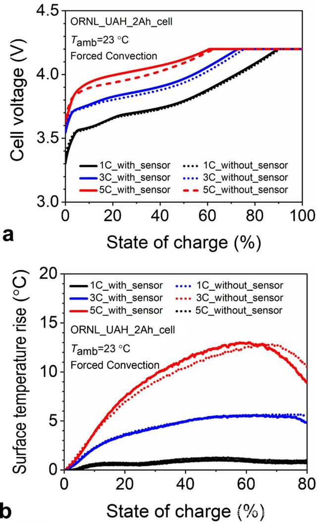 下圖為植入傳感器的實(shí)驗(yàn)電池和未植入傳感器的對(duì)照組電池的對(duì)比結(jié)果。其中a為充電電壓,b為表面溫度。實(shí)驗(yàn)組和對(duì)照組的電壓和表面溫度均非常接近。5C充電時(shí),實(shí)驗(yàn)組電池的電壓略高于對(duì)照組電池,可能歸因于植入傳感器之后,導(dǎo)致阻抗略微增加。