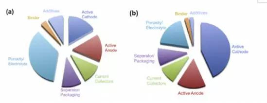 (現在鋰離子電池各組分的(a)體積占比和(b)質量占比)