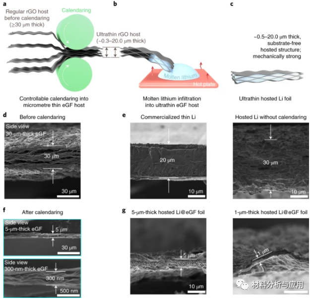 綜上所述,本文開發出一種制造超薄,獨立和承載的Li金屬膜的工藝,并展示了在預鋰化和高能量密度LMB中的應用。通過將電極厚度減小到微米級并同時提高陽極穩定性,可調節的微米級薄且獨立的Li-eGF薄膜為將來的高能量密度Li電池提供了一條途徑。這也表明,這種微米級的技術可能會打破當前制造中電極厚度的限制。