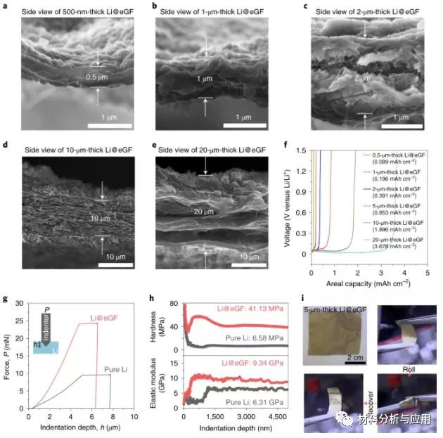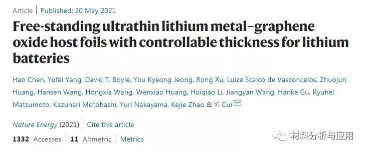 電池的精確預鋰化。現有的鋰金屬箔太厚(通常為50到750 μm),或者機械易碎性太差,不適用于這些應用。本文,斯坦福大學崔屹教授團隊在《Nature Energy》期刊發表名為“Free-standing ultrathin lithium metal–graphene oxide host foils with controllable thickness for lithium batteries”的論文,研究開發了一種簡單和可擴展的方法,在氧化石墨烯主體內合成超薄(0.5 ~ 20 μm)、獨立且機械堅固的鋰金屬箔。