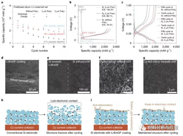 圖4:超薄Li- eGF薄膜改善了硅陽極的初始ICE和循環穩定性。