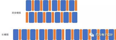 1)如果是同一個電池容量的鐵鋰和三元電芯,鐵鋰會明顯的比三元要厚,造成的就是厚-薄-厚-薄-厚的排列。在直接設(shè)計中,不管是雙排模組還是長模組,會出現(xiàn)以下的設(shè)計狀態(tài)。直觀的概念,就是CCS母線排的設(shè)計會有難度,模組在制造過程中有難度,整體的膨脹力控制有難度。當然你下定決心,這些在工藝層面都是可以做的。