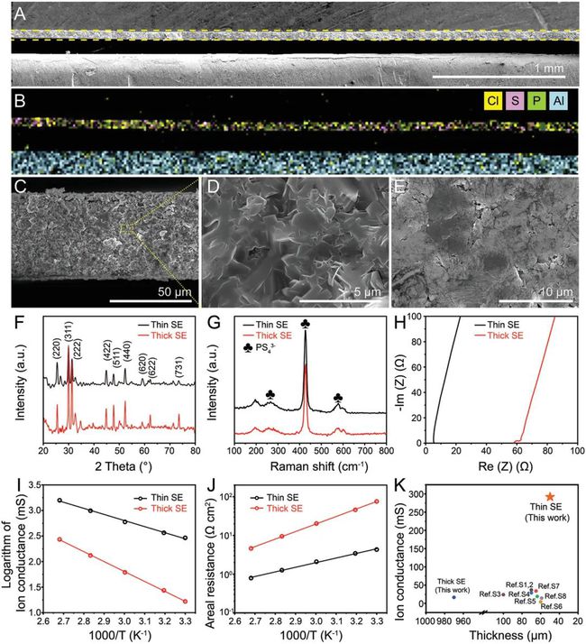 電池水平上提供了相當低的能量密度(<50 Wh kg -1和<100 Wh L -1),這主要歸因于厚電解質膜的使用。在片狀ASLBs中,理想的SE膜應同時具有低面電阻、高離子電導、低厚度、高機械和化學穩定性以及輕重量。然而,目前ASLBs中使用的硫化物固態電解質(SE)膜仍存在高厚度(0.5-1.0 mm)和低離子電導(<25 mS)的問題,這限制了電池級能量和功率密度。