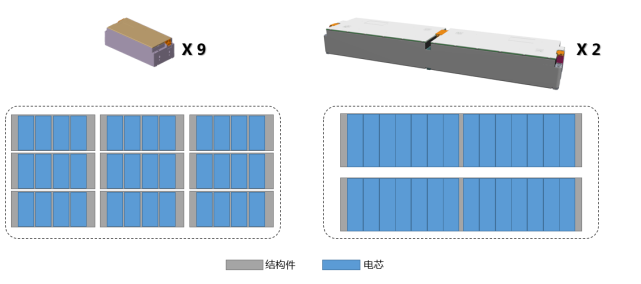 CTP的全稱為cell to pack, 也就是將電芯直接集成到電池包內的技術,就好比上面提到的袋裝咖啡直接放到大包裝箱里。采用這種技術的電池包取消了電池模組的設計,降低電池成本,來提升電池包的能量密度。