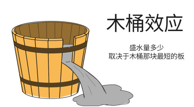 首先我們要先了解一個叫“木桶效應”的理論,一只木桶能盛多少水,并不取決于最長的那塊木板,而是取決于最短的那塊木板。