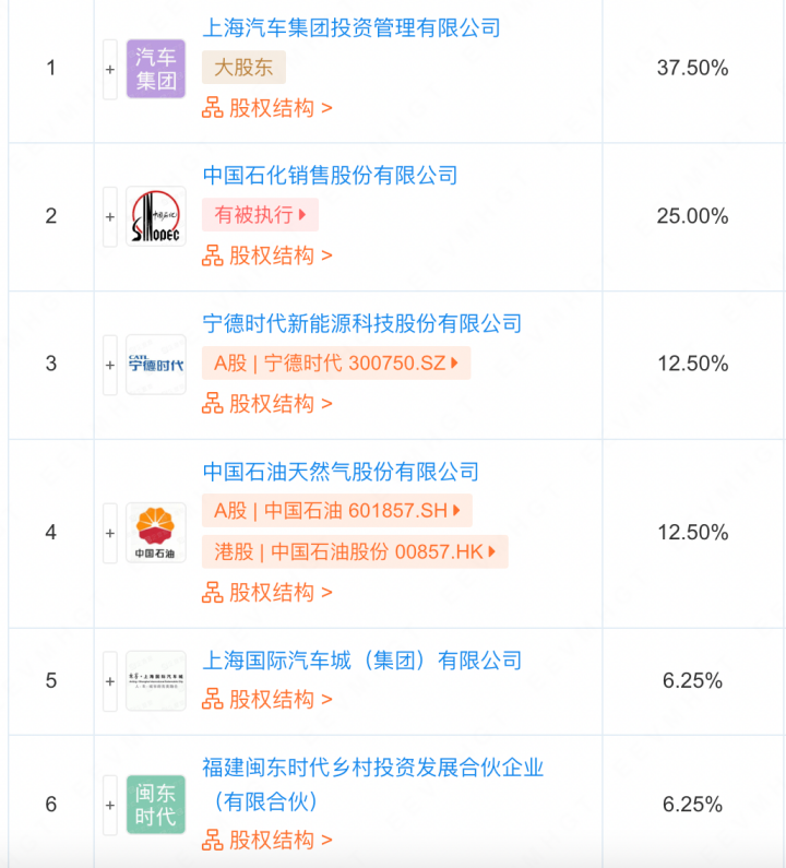 在合資公司的股權架構中,上汽和中石化是前兩大股東,寧德時代股份為12.5%,與中石油并列第三大股東。