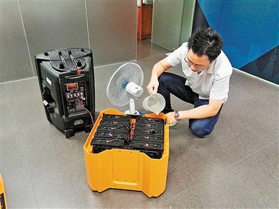 在銀星科技園里的深圳海能動力控股有限公司,總經理鄭淞元拿出一個沒有電的安全警示三腳架,他取出電池,將正負極在一個水杯中沾了一下,再將電池裝回去,三腳架立即閃動起來。鄭淞元又拿來一個應急發電手提燈,摳開電池盒記者驚訝地發現里面沒有電池,只有一盒乳白色的水。鄭淞元用手指沾了沾電池盒里的水,然后將手指頭放在嘴里嘬了一下說:“是鹽水!”