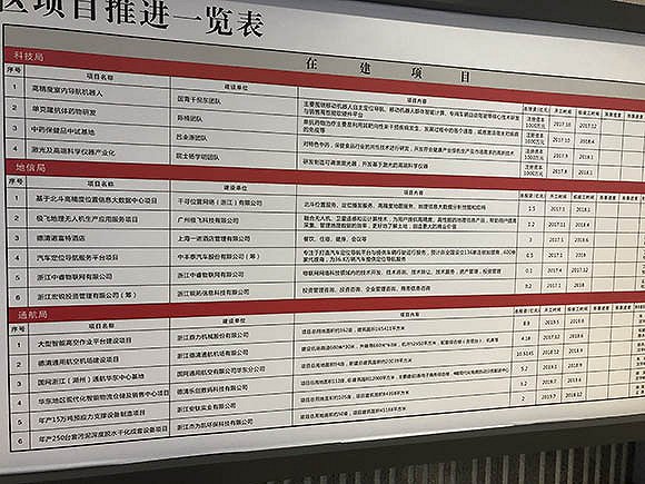 在德清高新區(qū)管委會(huì)樓下,有一整面墻都是德清高新區(qū)官網(wǎng)項(xiàng)目的進(jìn)展圖——其中包括北斗高精度地理位置大數(shù)據(jù)中心項(xiàng)目、機(jī)飛無人機(jī)項(xiàng)目等共計(jì)百余項(xiàng)。具體涵蓋項(xiàng)目名稱、建設(shè)單位、項(xiàng)目內(nèi)容、投資額、開工竣工時(shí)間等。