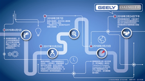 一天以后,2月24日,德國戴姆勒集團和中國吉利集團先后承認,吉利集團在二級市場購買戴姆勒9.69%的股份,成為第一股東。