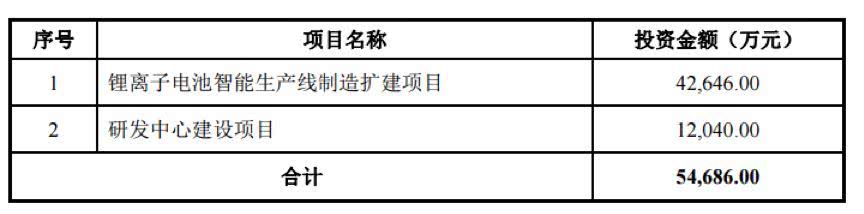 公司申請上市擬募集資金5.47億元,將投資于投資于鋰離子電池智能生產線制造擴建項目及研發中心建設項目。