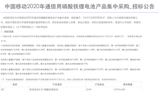 10廠商中標中國移動2020年通信用磷酸鐵鋰電池產品集中采購項目2021-07-15 10:18