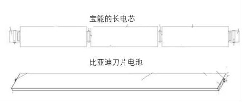 這種橫向放置的模組最特別的地方在于它的長電芯,電芯的長度是整個電池包的寬度,跟比亞迪的刀片電池類似。但是,與比亞迪刀片電池不同的是,寶能電池的長電芯并不是一個單獨的長電芯,而是由多個電芯串聯而成。