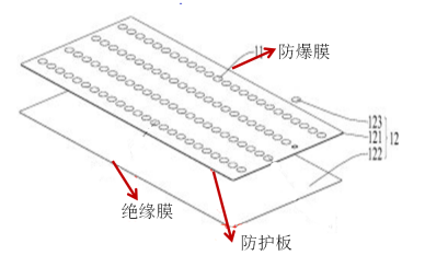 電池頂部的防爆泄壓系統(見下圖),從上到下一共有三層,底部是絕緣膜、中間有防護板,頂部防爆膜組成,絕緣薄膜,用于電芯極柱、連接片和FPC采集片的絕緣防護,防護板用于保護電芯,頂部防爆膜通過耐高溫結構膠粘接在防護板上。