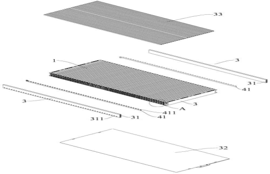 1電芯模塊;3 密封板;31滅火泄壓煙道/第一泄壓孔;32 冷卻板;33散熱板;41采集片;411檢測觸頭