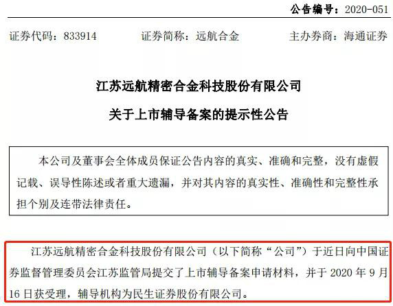 9月17日,新三板鋰電材料企業遠航合金(833914)發布公告稱,公司于近日向江蘇證監局提交了上市輔導備案申請材料,并于2020年9月16日獲受理,輔導機構為民生證券,公司已進入首次公開發行股票并在創業板上市的輔導階段。