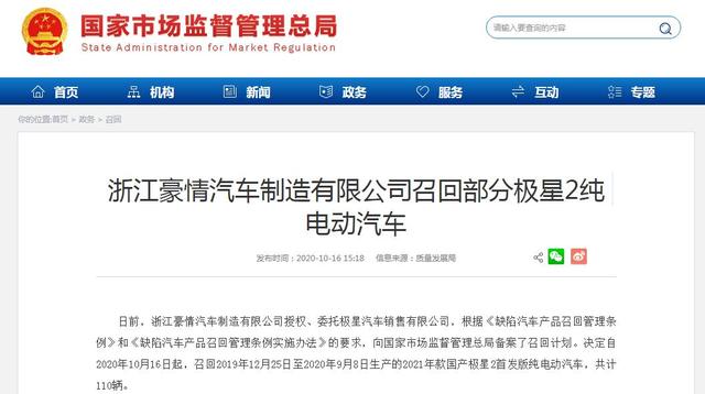 國家市場監管局介紹,日前,浙江豪情汽車制造有限公司授權、委托極星汽車銷售有限公司,根據《缺陷汽車產品召回管理條例》和《缺陷汽車產品召回管理條例實施辦法》的要求,向國家市場監督管理總局備案了召回計劃。決定自2020年10月16日起,召回2019年12月25日至2020年9月8日生產的2021年款國產極星2首發版純電動汽車,共計110輛。