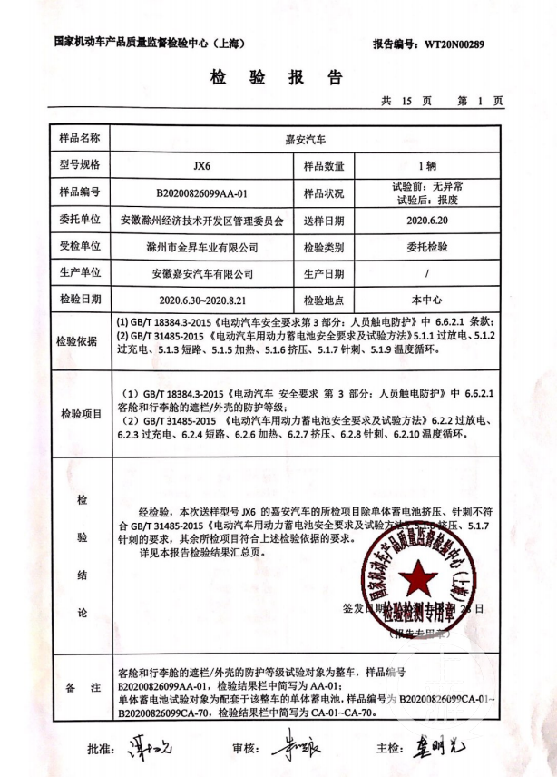 2020年8月28日,受安徽滁州經濟技術開發區管理委員會委托,國家機動車產品質量監督檢驗中心(上海)出具了嘉安汽車《檢驗報告》。檢驗報告顯示,所檢項目除單體蓄電池擠壓、針刺不符合相關要求外,其余所檢測項目均符合相關標準。