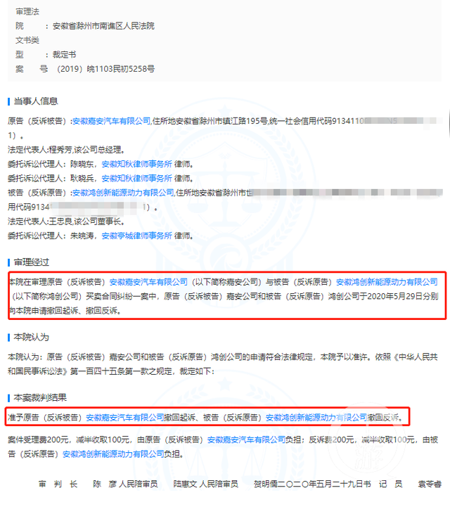 據2020年5月29日南譙區人民法院作出的(2019)皖1103民初5258號《民事裁定書》顯示,南譙區法院在審理原告(反訴被告)安徽嘉安汽車有限公司與被告(反訴原告)安徽鴻創新能源動力有限公司買賣合同糾紛一案中,嘉安公司和鴻創新能源于2020年5月29日分別向本院申請撤回起訴、撤回反訴。因此,南譙區法院作出準許雙方撤訴的民事裁定。