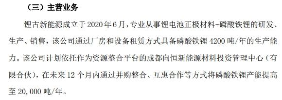 根據(jù)公告披露,聚恒益新材料的核心業(yè)務是“專業(yè)石墨化”。鋰古新能源專業(yè)從事鋰電池正極材料磷酸鐵鋰的研發(fā)、生產、銷售,該公司通過廠房和設備租賃方式具備磷酸鐵鋰4200 噸/年生產能力。