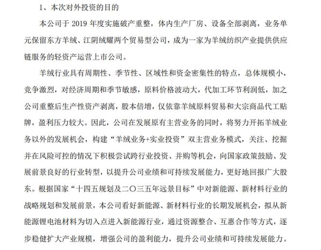 對于上述投資,中銀絨業(yè)表示,是為實現(xiàn)公司羊絨業(yè)務+實業(yè)投資”雙主業(yè)戰(zhàn)略發(fā)展,逐步穩(wěn)健擴大產業(yè)規(guī)模,增強公司盈利能力,提升業(yè)績和可持續(xù)發(fā)展能力。