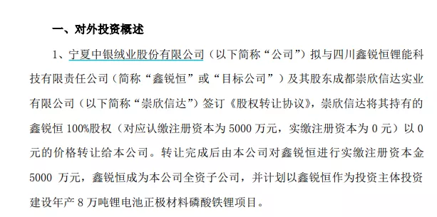 中銀絨業(yè)披露,公司擬與四川鑫銳恒鋰能科技有限責任公司(簡稱“鑫銳恒”)及其股東簽訂協(xié)議,其股東將所持鑫銳恒100%股權(對應認繳注冊資本5000萬元,實繳注冊資本0元)以0元價格轉讓給公司。