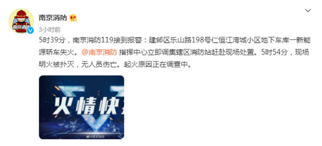 南京消防微博相關(guān)信息顯示,今日5時39分,南京消防119接到報警,建鄴區(qū)樂山路198號仁恒江灣城小區(qū)地下車庫一新能源轎車失火。南京消防指揮中心立即調(diào)集轄區(qū)消防站趕赴現(xiàn)場處置。5時54分,現(xiàn)場明火被撲滅,無人員傷亡。起火原因正在調(diào)查中。