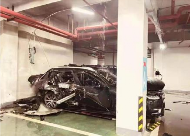 從網(wǎng)傳圖片可以看出,爆炸后車輛全身都有不同程度的毀損,并波及到了附近多輛汽車,此外車輛上方的水管也被震裂,現(xiàn)場水流不止。
