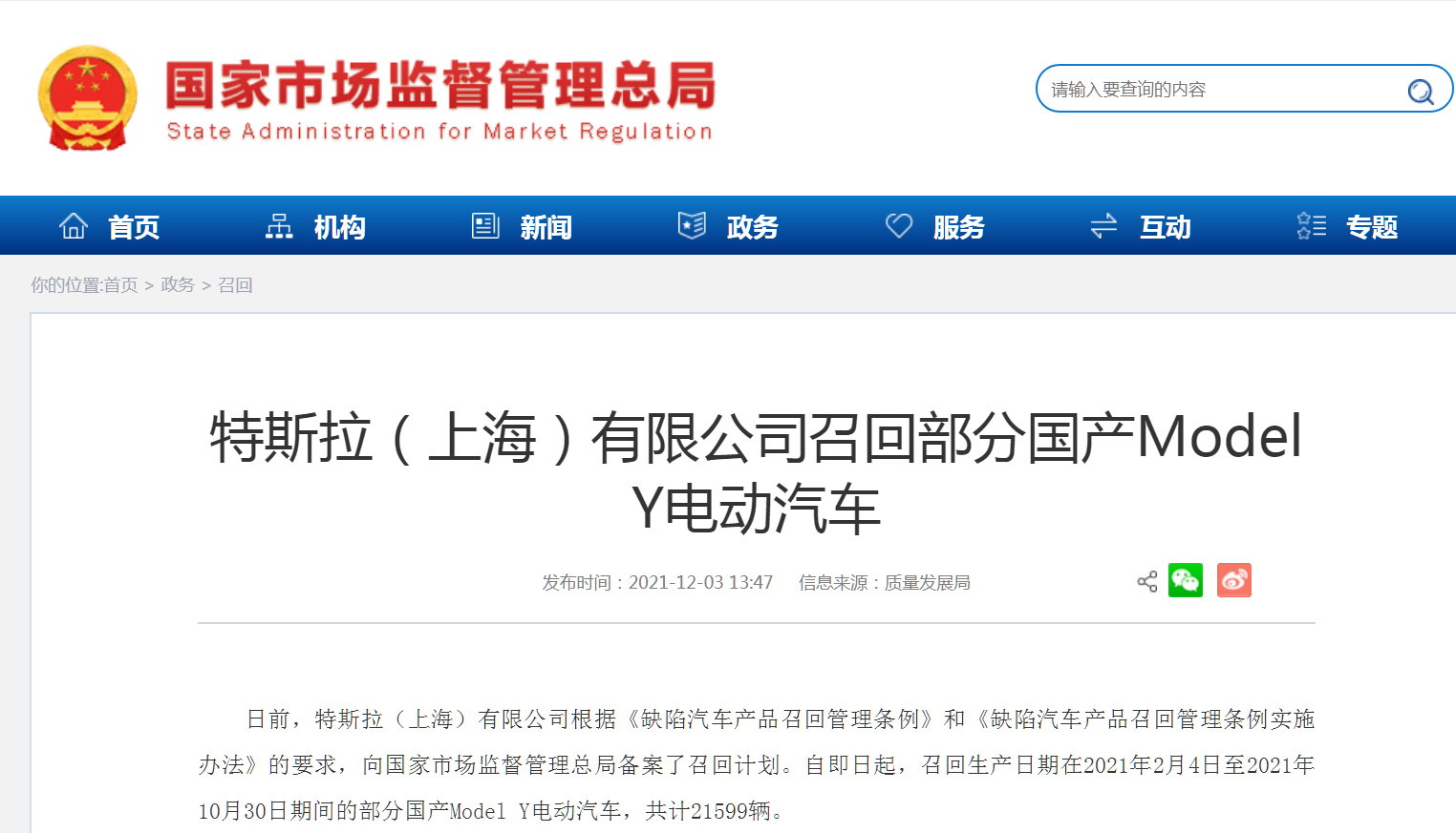 12月3日,特斯拉(上海)有限公司向國家市場(chǎng)監(jiān)督管理總局備案了召回計(jì)劃。自即日起,召回生產(chǎn)日期在2021年2月4日至2021年10月30日期間的部分國產(chǎn)Model Y電動(dòng)汽車,共計(jì)21599輛。