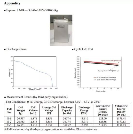 恩力動力采用了自主開發的鋰金屬電極界面控制技術以及獨特的電解質/液技術,在兼顧電池循環穩定性的前提下,進一步減少了電池中非活性材料的占比,從而在實現能量密度的大幅提升的前提下提升了電池的安全性。2021年10月,恩力動力發布的新一代鋰金屬電池重量密度達520Wh/kg,體積能量密度1100 Wh/L,容量為3600mAh。并得到了包括日本軟銀在內的中、日多家第三方機構對多個電池樣本進行的多次可重復的測試驗證。樣品測試結果表現出優異的產品性能(安全,高能量/功率密度,充放電快,寬溫域,長壽命)。這是繼2021年3月15日恩力動力與Softbank Corp.聯合發布了能量密度450Wh/kg鋰金屬電池之后取得的又一重大突破。該款電池的樣品及電池規格已在2021年9月29日至10月1日的東京國際二次電池展(BatteryJapan)上首次亮相,并引起業界廣泛關注。有關高比能電池的關鍵技術,恩力動力首席技術官(CTO)車勇博士已在2021年度日本春季電化學年會以及日本“第62屆日本電池研討會”上進行學術發表。