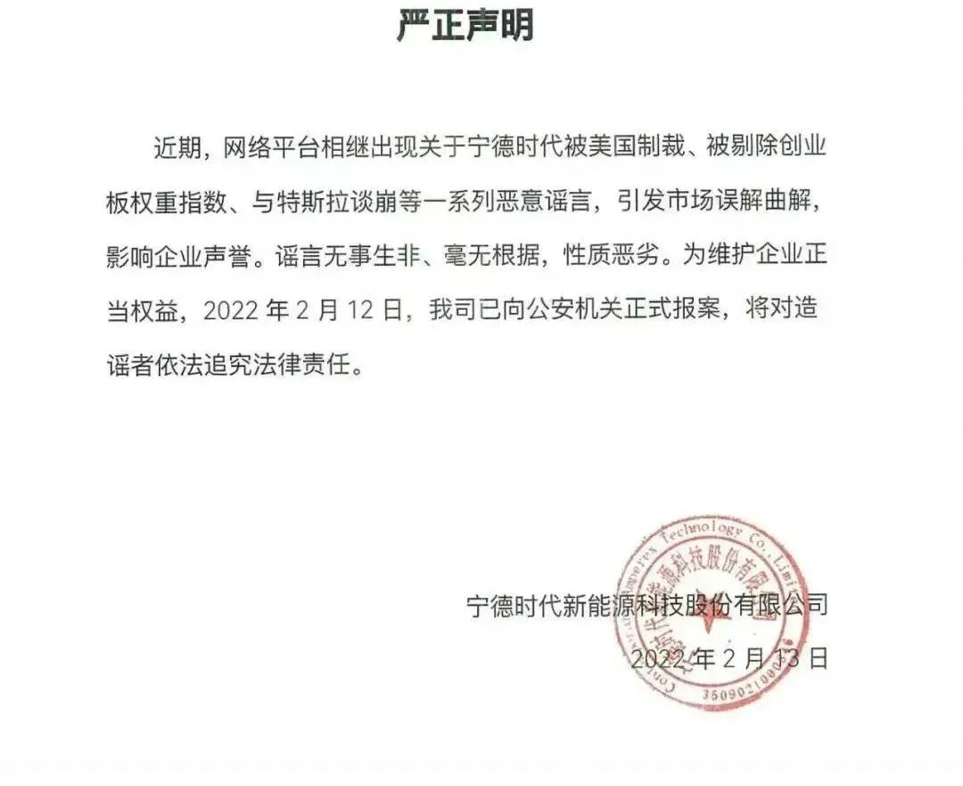 聲明稱,近期,網絡平臺相繼出現關于寧德時代被美國制裁、被剔除創業板權重指數、與特斯拉談崩等一系列惡意謠言,引發市場誤解曲解,影響企業聲譽。謠言無事生非毫無根據,性質惡劣。為維護企業正當權益,2022年2月12日,寧德時代已向公安機關正式報案,將對造謠者依法追究法律責任。