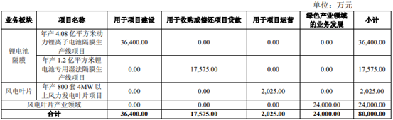 電池隔膜項目”)的項目建設;擬使用募集資金1.76億元用于償還年產1.2億平方米鋰電池專用濕法隔膜生產線項目(以下簡稱“常德電池隔膜項目”)的有息借款;擬使用募集資金2025萬元用于年產800套4MW以上風力發(fā)電葉片項目的項目運營;擬使用募集資金2.4億元用于綠色產業(yè)領域發(fā)展。