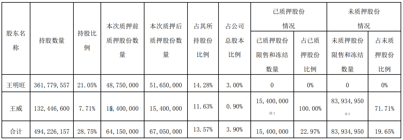 同時,公告顯示,控股股東王明旺補充質押股份合計290萬股。截至2022年4月25日,王明旺及其一致行動人累計質押股份數6705萬股,占其所持股份比例的13.57%,占公司總股本的3.9%。