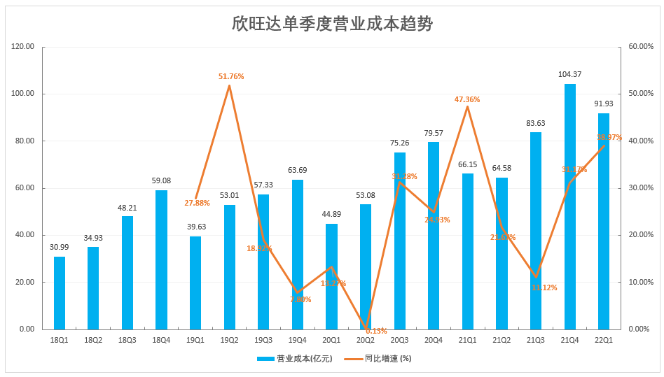 數據顯示,一季度公司營業成本達91.93億元,同比增速近39%,快于營收增速的35.11%。