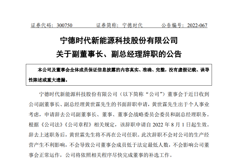 8月1日,寧德時代發布了一系列人事變動公告。和寧德時代董事長曾毓群一起創業的副董事長黃世霖出于個人事業考慮,申請辭去副董事長、董事、董事會戰略委員會委員和副總經理職務;周佳辭去總經理職務,成為公司副董事長;董事長曾毓群兼任總經理。
