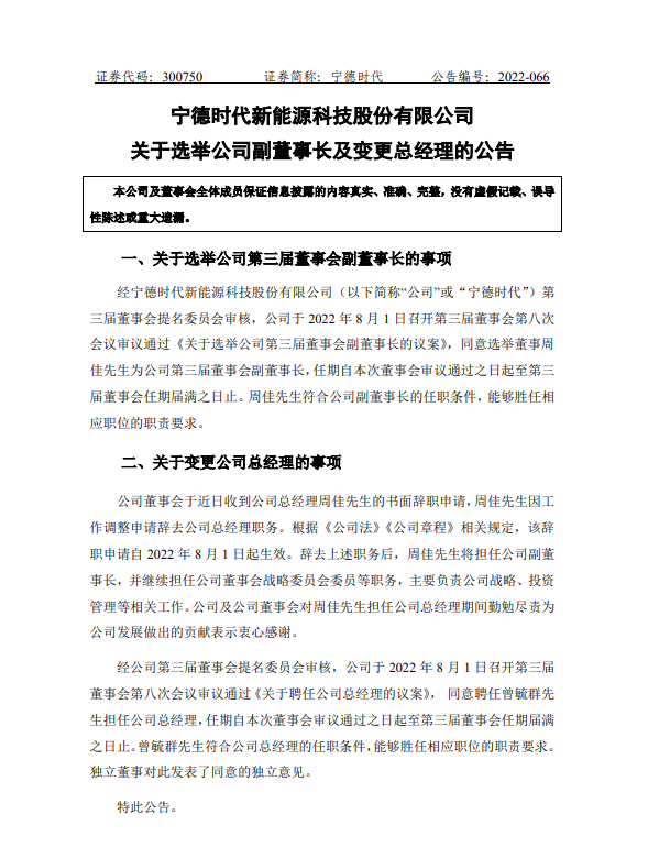 寧德時代回復汽車商業評論記者稱,為了加強公司在上游板塊、應用領域和創新領域的投資管理,周佳將擔任公司副董事長,并繼續擔任董事會戰略委員會委員等職務,主要負責公司投資管理委員會、資源委員會、市場體系有關工作。曾毓群作為公司的創始人和董事長,對新能源產業的發展以及對公司的文化、管理、業務發展的理解更加全面深刻,是現階段擔任總經理的最佳人選。