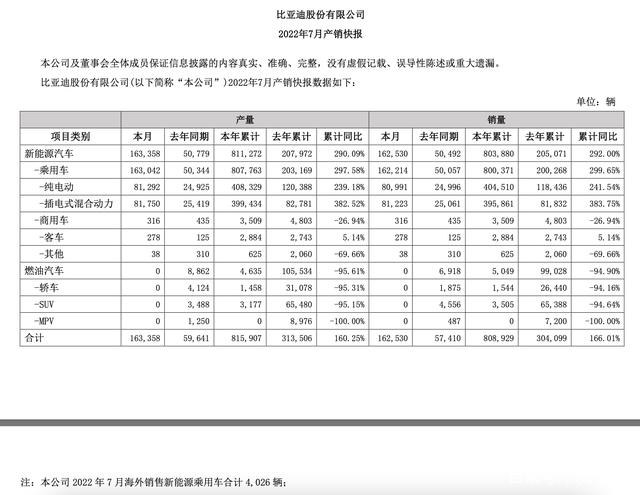 8月3日,比亞迪披露7月產(chǎn)銷快報。其7月銷量達162530輛,同比增長183.1%,其中共銷售新能源乘用車162214輛,同比增長184.7%。本年累計銷量803880萬輛,同比增長292%。
