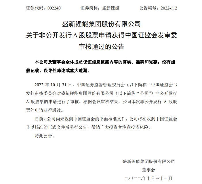 近日,盛新鋰能(002240.SZ)發布公告稱,10月31日,中國證監會發行審核委員會對公司非公開發行A股股票的申請進行了審核。根據會議審核結果,公司本次非公開發行A股股票的申請獲得通過。